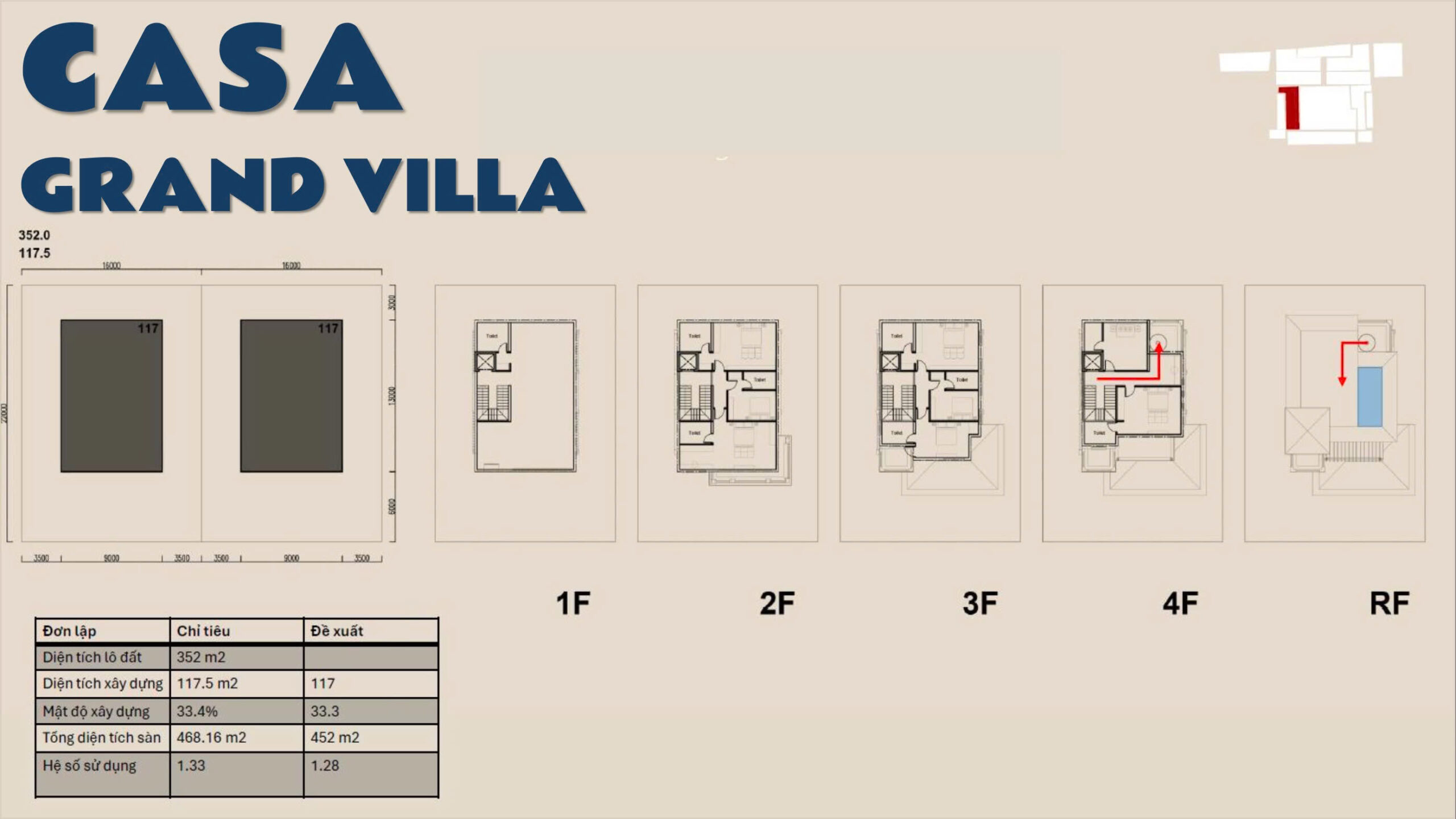 | Casa Grand Villa | 4 tầng + 1 hầm, diện tích đất 308–319m², kích thước 16 x 22m |