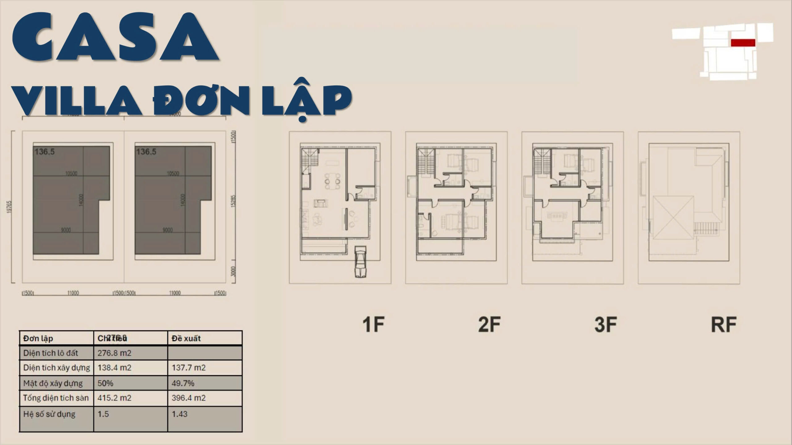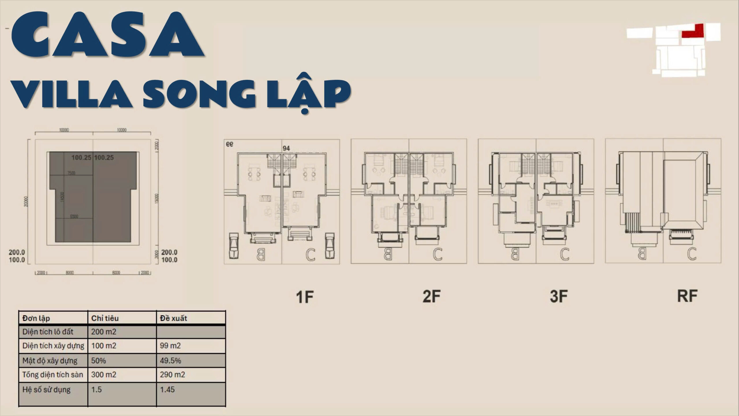 | Casa Villa Đơn Lập | 3 tầng + 1 hầm, 176 căn, diện tích đất khoảng 280m², kích thước 14 x 20m |